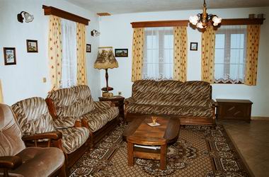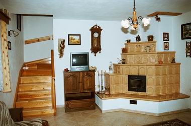 Plynule přechází do jídelny s kuchyní. Je vybaven dvěma pohodlnými sedačkami a křeslem, konferenčním stolkem, kuchyňským stolem, TV příjímačem, rádiem, ale jsou zde také kachlová kamna a nebo krb.