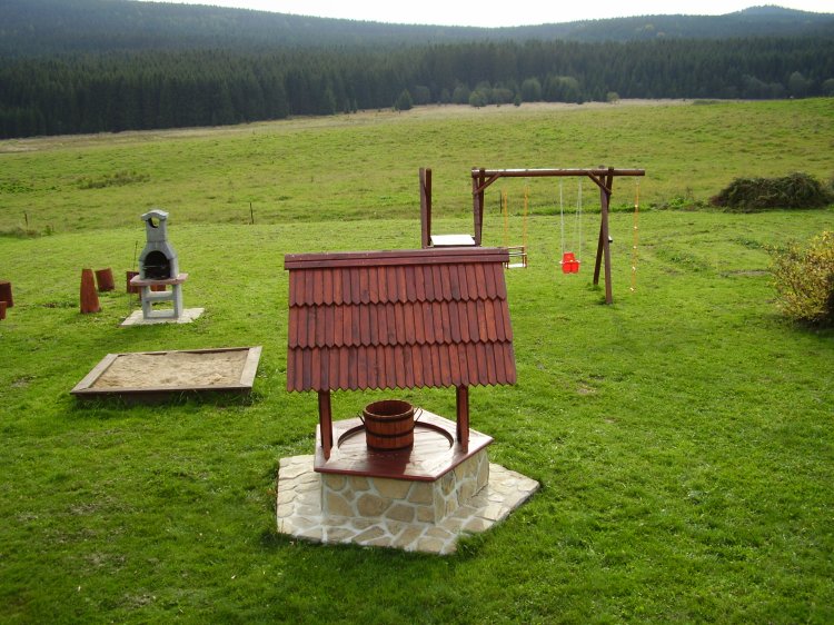 Součástí nabídky je i možnost využití příslušenství v okolí chalupy - 2 houpačky, dětský žebřík, houpací lavička, 2 bazény (větší pro dospělé, menší pro děti), trampolína, hřiště 6x12 m s umělým povrchem (volejbal, nohejbal, basketbal), pinponkový stůl, tabule na kreslení pro děti, pískoviště, krbové posezení, ohniště, detailní velká mapa okolí.